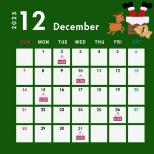12月は以下の日程でお休みをいただきます。 2(火)、10日(水)、15(月)、26(金)、31(水) ※テイクアウト、カフェ、たい焼き体験®、デリバリー、すべてお休みいたします。 この間はお問合せ及びお電話をいただいて