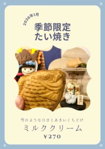2026年1月の季節限定品「ミルキークリーミーたい焼き」のご紹介です。 真冬の雪景色を思わせるミルキーでクリーミーなたい焼き。 ほっとするような、懐かしいような、やさしい甘さとミルクのコクを楽しんでください!